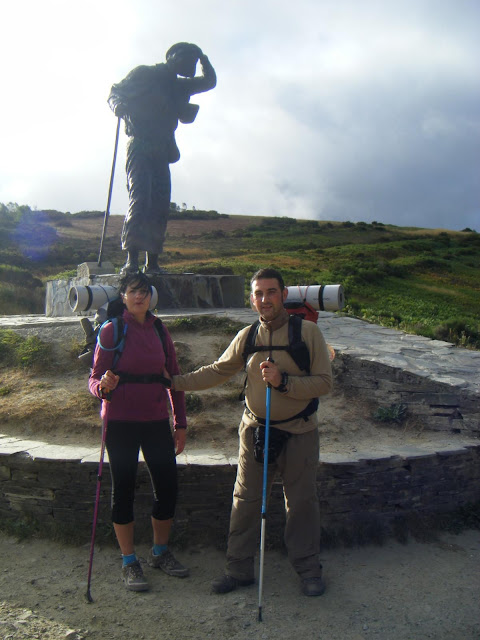 Aquí se alza la escultura de un peregrino medieval que avanza contra el viento que incluso en esta época del año (agosto) azota implacable.